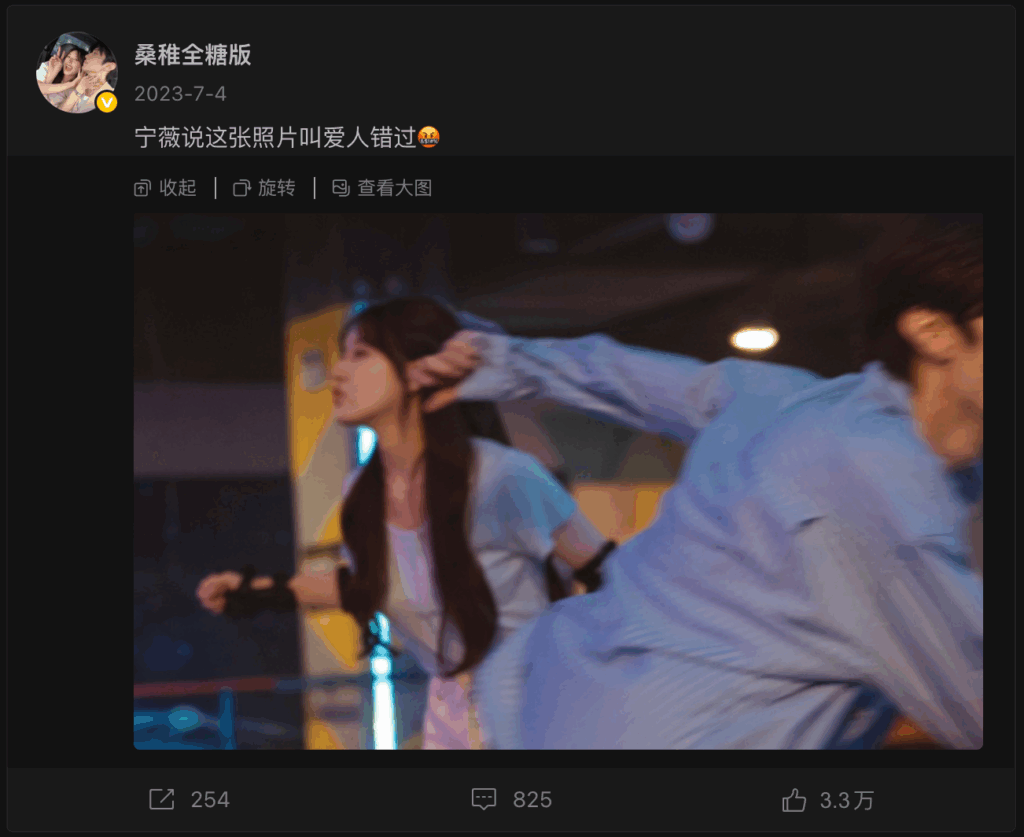 주인공 쌍즈의 웨이보 ‘쌍즈 풀 슈가 버전’에는 “닝웨이가 애인이 기회를 놓쳤다고 했어요”라는 문장과 함께 드라마의 한 장면을 올렸다.